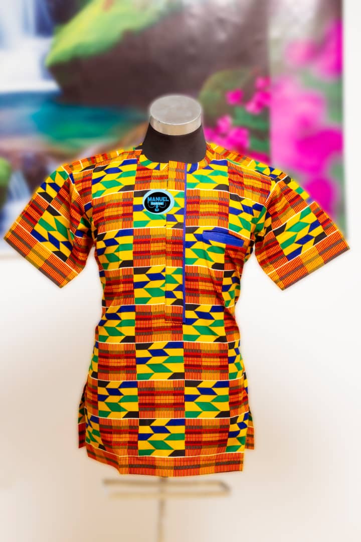 Make a bold statement with this Manuel Fashion Kente Short-Sleeve Shirt, where vibrant tradition meets contemporary flair. Crafted from high-quality, lightweight cotton fabric, this shirt offers a comfortable fit while delivering a striking appearance. The tunic features a rich, multicolored Kente pattern with yellow, green, red, blue, and black geometric designs, celebrating cultural heritage with a modern edge. Enhanced with a discreet chest pocket adorned with a "MANUEL" badge, this piece is perfect for cultural celebrations, casual outings, or stylish events. At Manuel Fashion, we combine heritage and innovation to provide quality clothing for every occasion—from timeless classics to modern trends, our aim is to help you look and feel your best. Complete your look with tailored trousers and sandals for an effortlessly chic appearance.